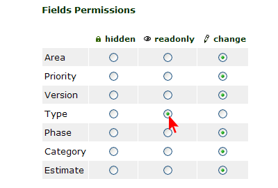 4. Specify "hidden", "read-only" or "change" access for the "Type" field and submit your changes.