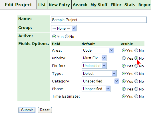 4. Set "visible" to "No" for the "Priority" field and submit your changes.